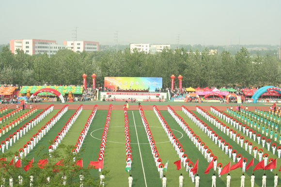 上午8时30分,礼炮齐鸣,国旗队、校旗队、花束方队、彩旗方队、各系代表队、裁判员方队,迈着矫健的步伐,喊着响亮的口号,依次通过主席台,接受检阅。广播体操表演和团体操表演《飘扬的旗帜》中,同学们整齐划一的动作赢得了观众的阵阵掌声,展现了大学生的青春亮丽,场面热烈、催人奋进。