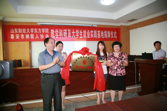 (学生通讯员 赵英皓)5月23日,泰安市纳税人协会与我校联合举办“共建教育实践基地”揭牌暨启动仪式在市纳税人协会举行。我校分党委副书记宫淑瑰,泰安市纳税人协会会长唐昭林出席揭牌仪式。会计学系主任朱德胜,会计学系副主任丁连第及在校大学生代表参加仪式。 我校分党委副书记宫淑瑰、市纳税人协会会长唐昭林分别为“山东财经大学东方学院教学科研暨就业实践基地”和“泰安市纳税人协会大学生税法宣传志愿团”揭牌。宫淑瑰向大家介绍了学校的发展情况,并表示此次合作是双方积极探索合作的新模式,实现校企合作双赢之目的。
