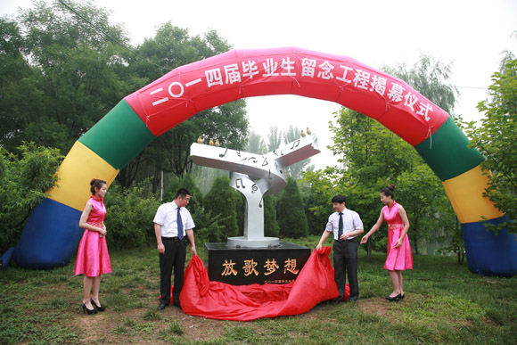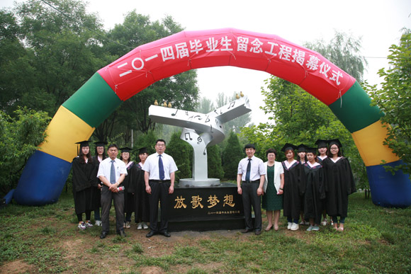 2014届毕业生留念工程座落于金源桥东南侧,取名为“放歌梦想”。寓意为青春放歌,带着梦想起航,表明了我校学子经过四年寒窗苦读,学业有成,即将踏入社会,立志成才,报效国家。雕塑整体造型寓意为我校是在党和国家政策法规的指引下,为创办校风严谨 、机制灵活、管理规范、特色鲜明,省内外有一定影响力的示范性独立学院而奋斗的决心;也寓意为我校以本科教育为主体,创品牌;以继续教育和国际合作办学为两翼,增强市场竞争能力的 “一体两翼”发展战略。2014届毕业生留念工程的落成又为我校增添了一处具有特殊意义的人文景观,代表了2014届全体毕业生对母校、对老师的深情厚意、美好祝愿和庄重承诺,它将作为历史的见证,为母校永久珍藏!
