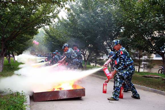 最后,在2#学生公寓前进行灭火演练。泰安市高新区消防大队副队长徐博涵向参加演练的2014级新生传授了有关消防安全“四个能力”的知识及灭火器的基本操作方法。讲解演示结束后,部分学生进行了灭火演练,在工作人员的指导下出色地完成了灭火任务,得到了在场观众的阵阵掌声。