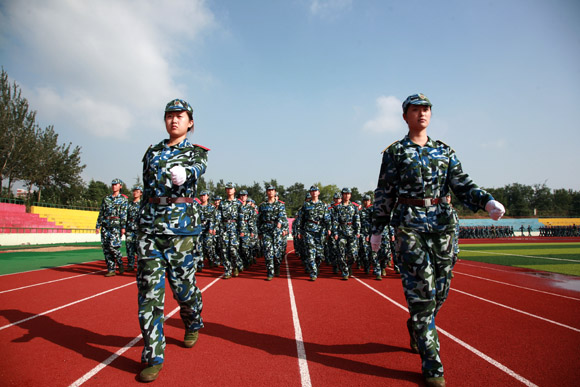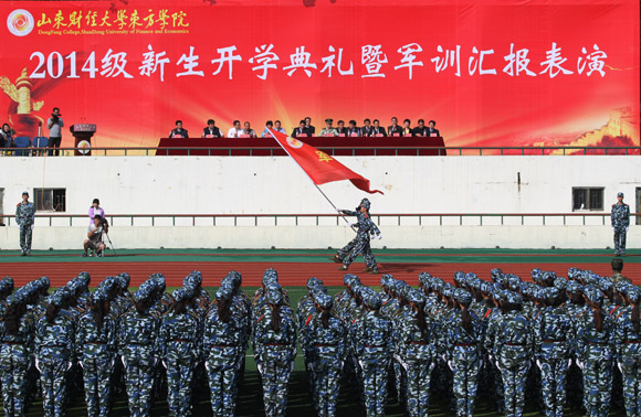 在庄严的国歌声中,五星红旗冉冉升起,2014级新生军训汇报表演正式开始。