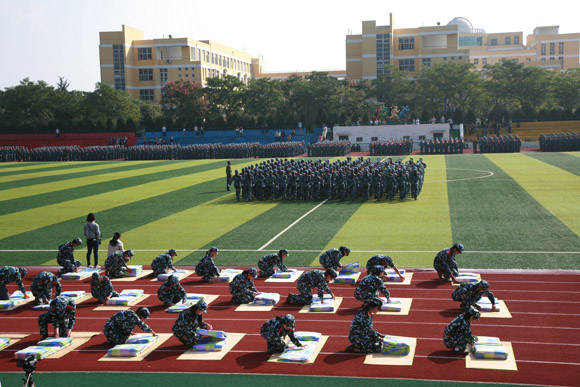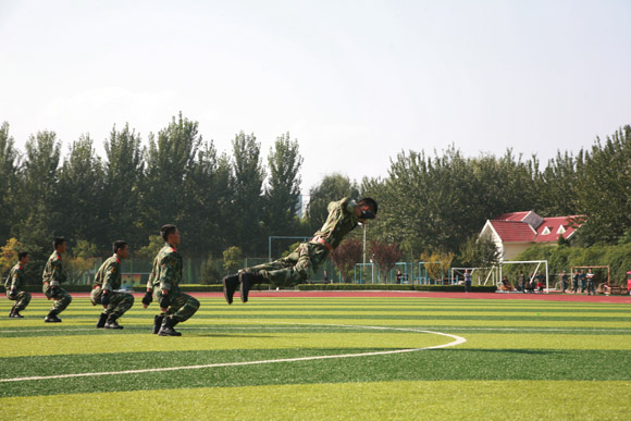 2014级全体新生首先进行分列式表演,各军训方队迈着矫健的步伐,高喊着口号,精神抖擞,整齐划一地经过主席台接受检阅。在随后的队列动作表演、擒敌拳表演、内务表演中,2014级新生用标准的动作,响亮的口号展现着飒爽英姿。承训教官们还为大家带来了精彩的擒敌术表演。