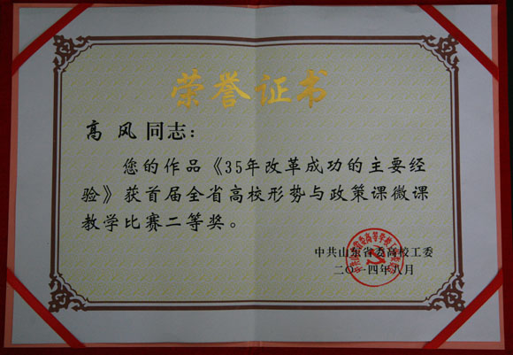 (通讯员 彭太来)为深入贯彻落实中宣部、教育部《关于进一步加强高等学校学生形势与政策教育的通知》精神,进一步推动全省高校形势与政策课教师教学能力和教育教学效果的提升,中共山东省委高校工委和中宣部《时事报告》杂志社组织开展了首届全省高校《形势与政策》课程微课教学比赛。经过专家组评审,评出优秀作品65件,其中一等奖10件、二等奖20件、三等奖35件,省高校工委予以通报表彰。我校高风副教授的作品《35年改革成功的主要经验》荣获二等奖。