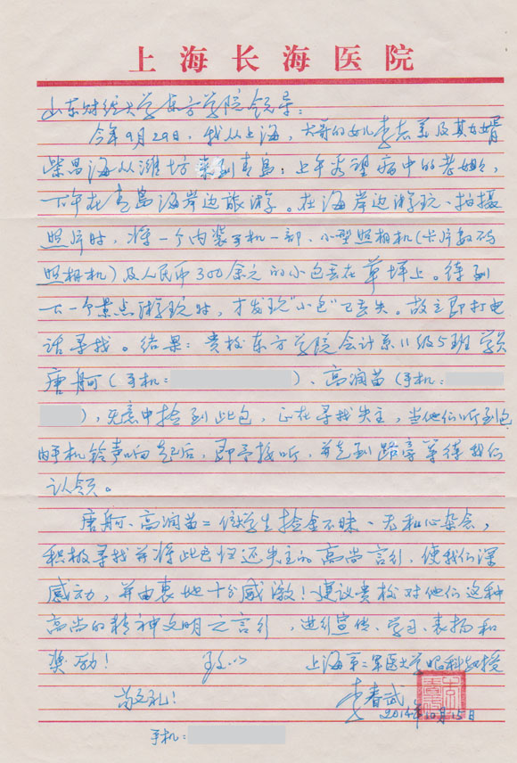 9月29日,我院会计学系11级会计本科5班唐珂、高润苗两位同学在青岛海岸边捡到一个手提包,内有现金、手机及相机等物品,他们积极寻找失主,并利用包内手机与失主李春武教授取得联系,并与他约定地点等待失主。李春武教授在感谢信中写道:“二位大学生拾金不昧,无私心杂念,积极寻找并将此包归还失主的高尚言行,使我们深受感动”。