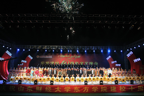 十载峥嵘岁月,十载春花秋实。勤奋朴实的东方人用自己的方式为母校十周岁生日献礼。伴随着教工合唱团带来的了《走向辉煌》、《光荣与梦想》,本次晚会落下帷幕。夜空中焰火交织,缤纷绚丽。台上台下,领导、老师、同学们欢腾雀跃,共同祝福东方学院的未来更加灿烂辉煌。