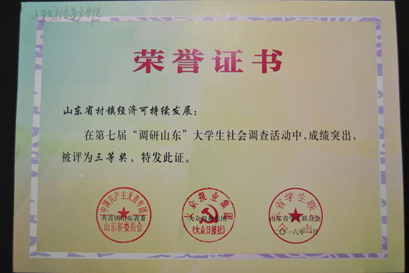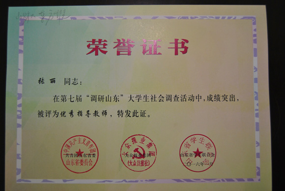 在共青团山东省委、大众报业集团、山东省学联联合下发的【2016】2号文件《关于表彰第七届“调研山东”大学生社会调查活动优秀组织单位、优秀指导教师和优秀调研成果的通知》 ,我校团委选送的“调研山东”《山东省村镇经济可持续发展》调研报告荣获三等奖,张丽老师被评为优秀指导教师。 (通讯员 赵鑫)