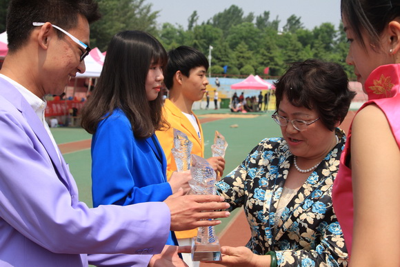 大会总裁判长、体育教学部主任嵇向中同志宣布本次运动会比赛成绩。精神文明评委会副主任、学团工作处副处长赵滨同志宣布精神文明奖、优秀组织奖获奖名单。党委书记宫淑瑰为各获奖单位颁奖。