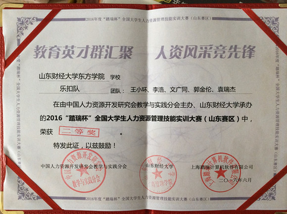 近日,由中国人力资源开发研究会教学与实践分会主办、山东财经大学承办的2016“踏瑞杯”全国大学生人力资源管理技能实训大赛(山东赛区)总决赛在济南举行,来自山东省高校的17支代表队参赛,分别进行综合实训中心方案设计、竞争对抗平台模拟经营、现场答辩等环节比赛,我院由凌瑶老师、李春月老师和谢殿钊老师指导的“乐扣队”获得山东赛区二等奖的好成绩。 通讯员 梁维江 撰稿 凌瑶 摄影 凌瑶