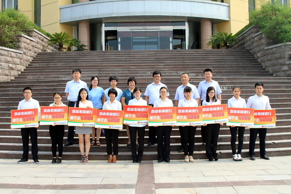 首批受资助的十名同学上台接受资助,陈帅同学代表受资助同学发言。对泰山农商银行的资助表达了真挚的感谢,会继续追逐梦想,通过自身的努力回馈学校、回报社会。