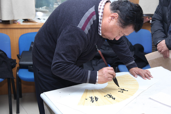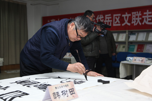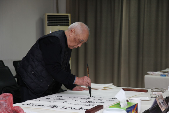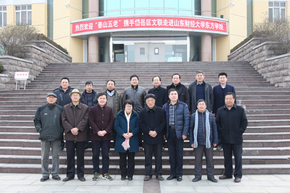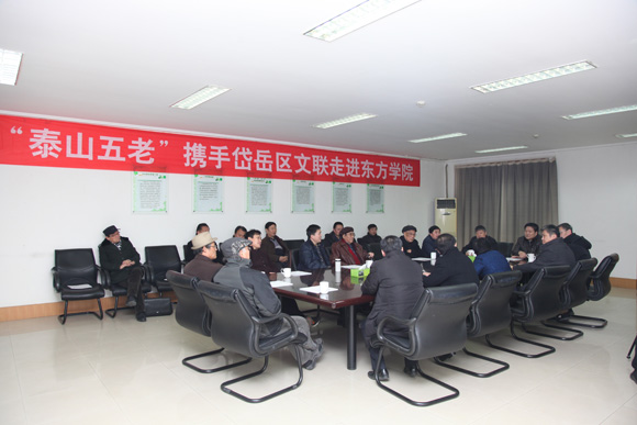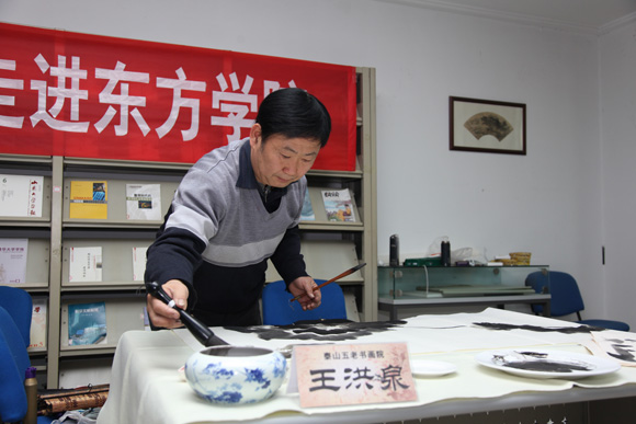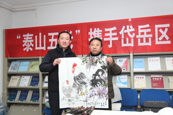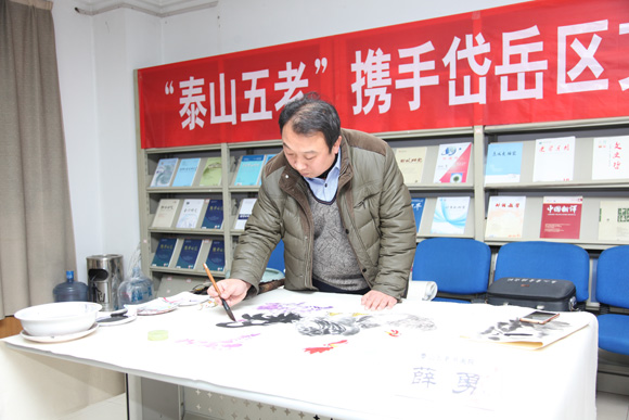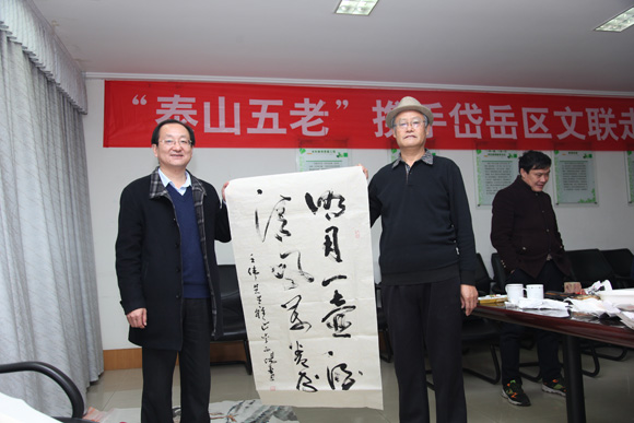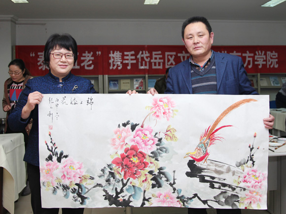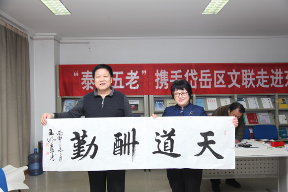 1月11日,学校内风清气爽,文墨飘香。“泰山五老”新春笔会暨岱岳区文联“书画家训 德润人心”活动在我校开展,“泰山五老”傅汝有、董绪忠,岱岳区文联主席张建平,岱岳区文联美术家协会主席李光富,岱岳区书法家协会主席李向阳,徂徕书院院长、区职业教育中心工会主席宋其圣等十余位书画家在我校挥毫泼墨,即兴创作出一幅幅寄托着对我校美好祝福的书画作品。
