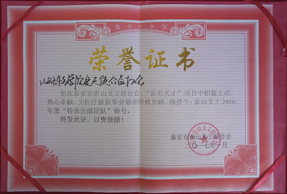 近日,从泰山义工联合会传来喜讯,我院工商管理系爱天使公益协会在泰安市泰山义工联合会开展的“家有天才”项目中积极主动,表现突出,为医疗健康事业做出突出贡献,被授予2016年度“特殊贡献团队”称号。