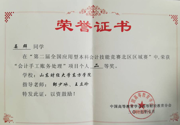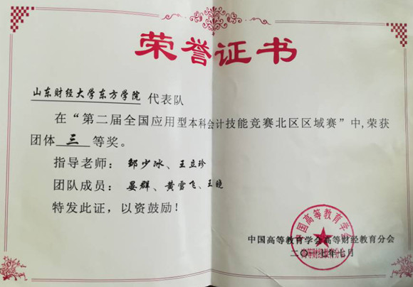 我校代表队由会计学专业晏群、黄雪飞、王晓组成,邹少冰、王立珍任指导老师。经过紧张激烈的角逐,我校代表队获得北区区域赛团体三等奖,晏群获得会计手工账模块个人二等奖,指导教师邹少冰、王立珍获得“团体三等奖优秀指导教师”荣誉称号。