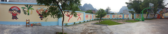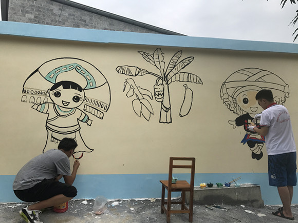 7月13日-7月24日,广西大化“追锋”支教队在广西省河池市大化瑶族自治县大化镇那马小学开展支教活动。从泰安踏上了去往广西的列车,四十多个小时的火车,景色从北方的麦田变成了南方的水田,山脉的线条也从硬朗变得柔和,支教期间,志愿者们除了开设语文、数学、英语、历史、地理这些文化课外,还开设了音乐、舞蹈、军体拳课。由于师资力量有限,孩子们在上初中之前,从来没有接触过英语,他们不知道四线三格,更不要说书写规范。为了让他们更好的学习英语,志愿者老师每天利用休息时间熬夜手画每个人的书写纸,他们说,只要能让孩子们学到些什么,熬夜什么的不碍事。在与当地团委的积极沟通下,我们的支教老师还在支教期间对学校的墙壁进行了创意绘画,顶着炎炎烈日,他们汗流浃背,所有的辛苦在看到孩子们的笑脸时,都烟消云散。第一部分的墙绘是两个身着少数民族服饰的小朋友,第二部分是运动项目系列的简笔画。希望孩子们能好好学习,茁壮成长,成为有志青年。