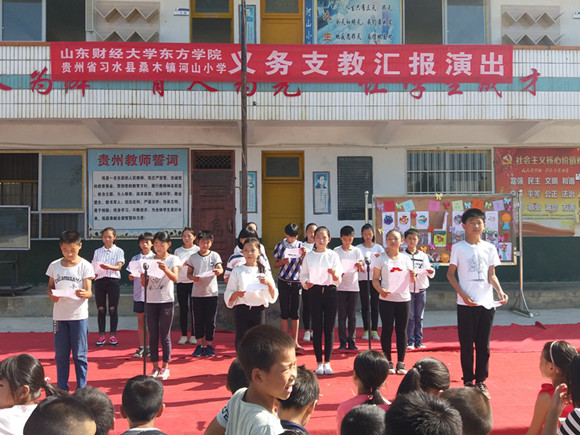 7月14日-7月25日,贵州习水“追锋”支教团队在贵州省遵义市习水县桑木镇河山小学开展义务支教活动。从泰安到重庆,再到贵州习水县,全程2280公里,历时32个小时。支教还没有正式开始,旅途的疲惫先给“天之骄子”们上了生动的一课。从开始上课到支教结束,十天的支教活动,队员们尽自己最大的努力为孩子们传授知识,带来快乐,用爱和真诚与孩子们结下了深厚的友情。孩子们学到了一些新的知识,支教队员们更是感觉自己受益匪浅,每个人都得到了锻炼,看到了自己的不足,增强了适应性,孩子们的真心和礼物让大家的心灵接受了一次又一次的洗礼。志愿者们瞻仰学习了四渡赤水革命纪念馆,并参加了团中央在遵义举办的庆祝建军90周年“重走长征路”大型主题教育活动。