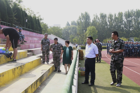9月22日上午,董事长陈磊,院长、党委书记宫淑瑰,副院长毕宏伟在办公室主任江东,学团工作处处长王伟以及军训教官负责人的陪同下,看望和慰问了正在参加军训的2017级新生。