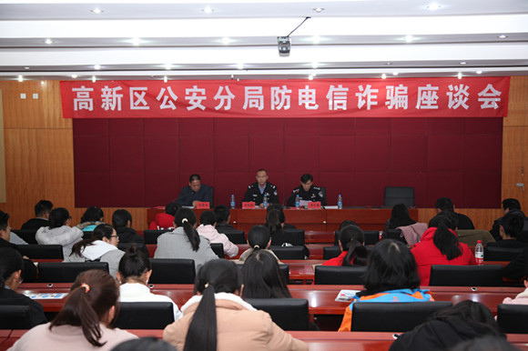 11月16日下午,高新区公安分局治安大队王宪胜副大队长、姜长春警官在我校5306会议室开展防诈骗宣传活动座谈会。本次会议由阴雷生副处长主持,相关部门人员、辅导员及学生代表参会。