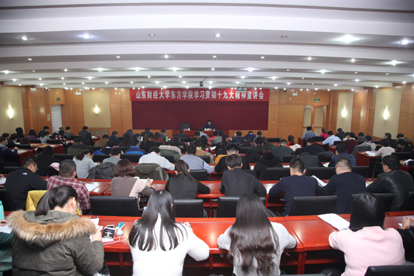 12月6日下午,学校在唯美楼国际报告厅召开学习贯彻十九大精神宣讲会,山东财经大学十九大精神宣讲团成员、东方学院院长、党委书记宫淑瑰作了题为《不忘立德树人初心 牢记改革发展使命 为建设高水平应用型财经大学而奋斗》的宣讲报告。在一个半小时的报告中,宫淑瑰围绕十九大报告的主要内容、思想精髓、实践意义三方面,结合东方学院的实际作了主题鲜明、内容丰富、深入浅出的解读。办公室主任、组织人事处处长江东主持宣讲会。学校党委委员、各部门负责人、全体教工党员和部分学生党员代表共150余人参加会议。