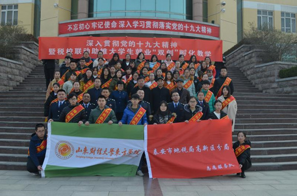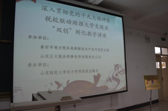 2017年4月1日,我校与泰安市高新区地税局和高新区国税局联合创办了税收宣传教学基地,旨在“播种税收文化、传播税收知识、促进大学生创新和创业”。本次讲座是继4月19日合作方成功举办“税收知识竞赛”活动后的又一次合作。