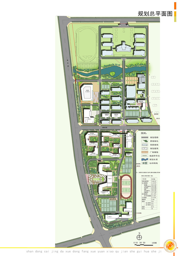 两轴:南北主轴:北起正阳大街校门主入口广场,向南经过北校区主广场,图书馆,南校区生活区,教学区、运动区至南校门;东西主轴:以南校区主入口为起点形成东向西主轴线。