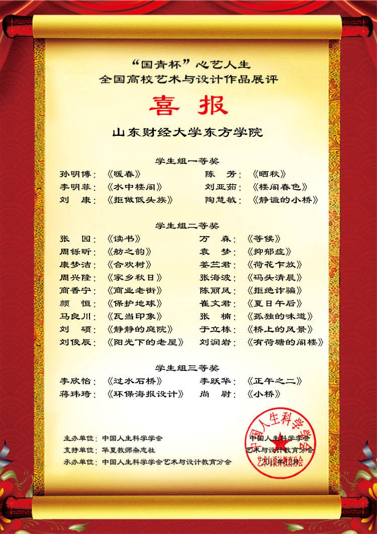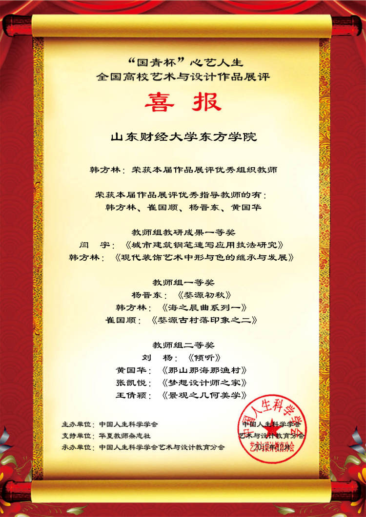 由中国人生科学学会主办的“国青杯”心艺人生全国艺术与设计作品展评的比赛中,我校人文艺术系师生表现非常突出,选派的59位师生参赛,战绩斐然。