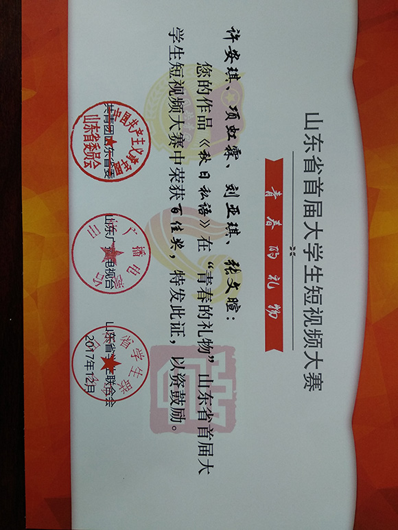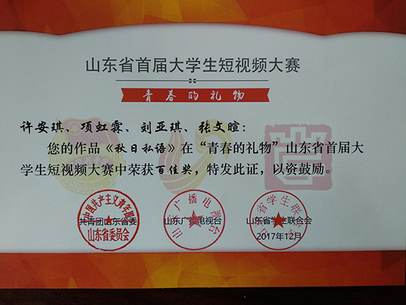 近日,山东省首届大学生短视频大赛颁奖典礼在省会济南落下帷幕,我校拍摄的短片《秋日私语》获得山东省首届大学生短视频大赛百佳奖。 短片《秋日私语》取材校园风景,是通过记录的形式拍摄的校园风光短片。短片由宣传中心聂圣军、柳绪鑫两位老师指导,大学生记者团、影视中心学生许安琪、项虹霖、刘亚琪、张文暄等制作。本届大赛由共青团省委、山东广播电视台、山东省学生联合会主办,山东广电传媒集团承办,旨在打造“互联网+”背景下以短视频为载体的校园文化活动,引导当代大学生通过短视频展现青春、向上的积极形象。
