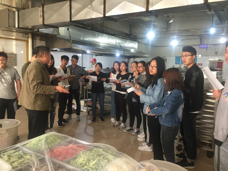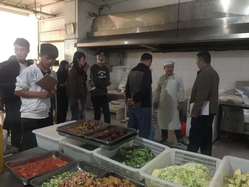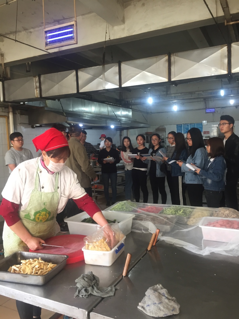 在饮食服务中心工作人员的陪同下,同学们依次参观了学生餐厅操作间、备餐间、库房、洗消间,听取了日常管理介绍,近距离参观了各种食品加工制作流程,就菜品种类、口味搭配等问题与有关工作人员进行了沟通,并提出了书面意见。