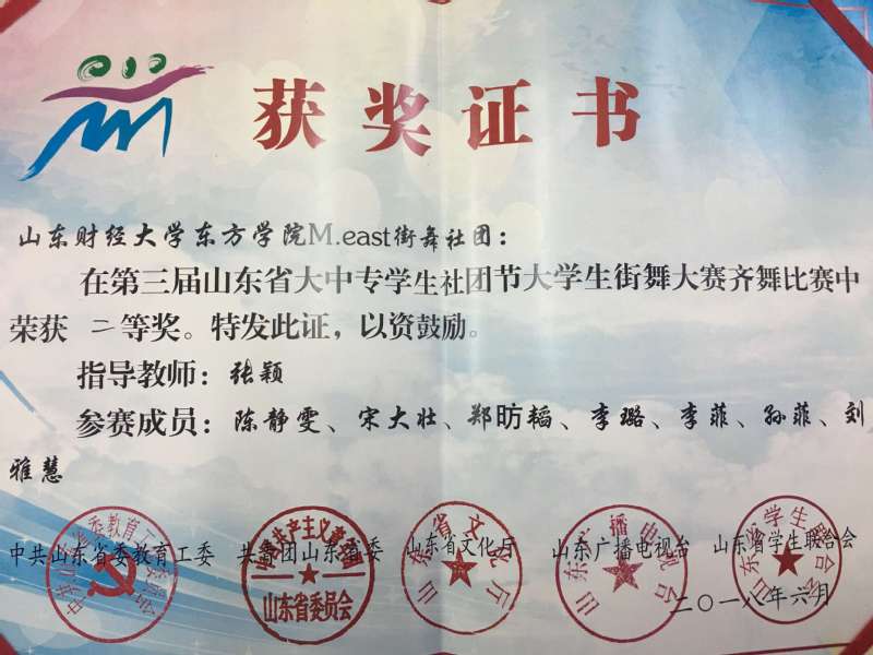 6月22日,第三届山东省大中专学生社团节大学生街舞大赛在德州职业技术学院报告厅举行,来自全省14所高校的25支代表队近200名选手参加比赛。我校M.east街舞社团来自会计学系、人文艺术系和国际商务系的郑昉韬、李璐、陈静雯、李菲、宋大壮、孙菲和刘雅慧七位同学在张颖老师的带领下参加了此次比赛。在比赛中,我校参赛社团不畏强手,出色发挥,以总分第四的成绩荣获齐舞二等奖。