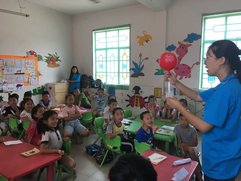支教队员为孩子们展示小苏打白醋冲气球实验