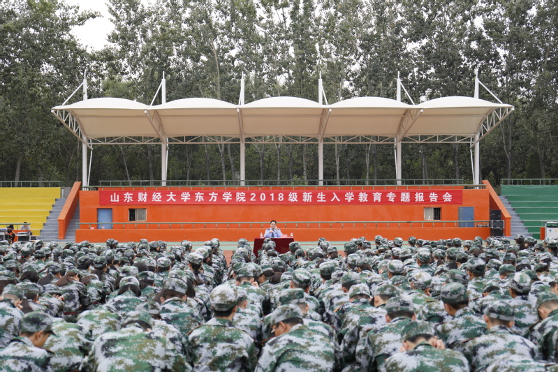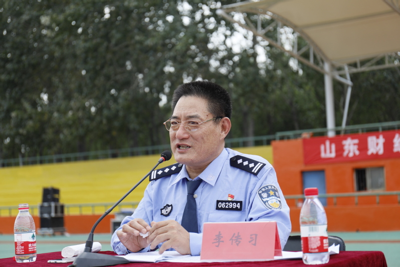 9月13日下午, 2018级新生法制教育报告会在学校运动场举行,泰安市公安局高新区分局法制室主任李传习、高新区消防大队宣传专员周晓帅,分别向同学们宣讲了预防电信诈骗知识和消防安全常识。