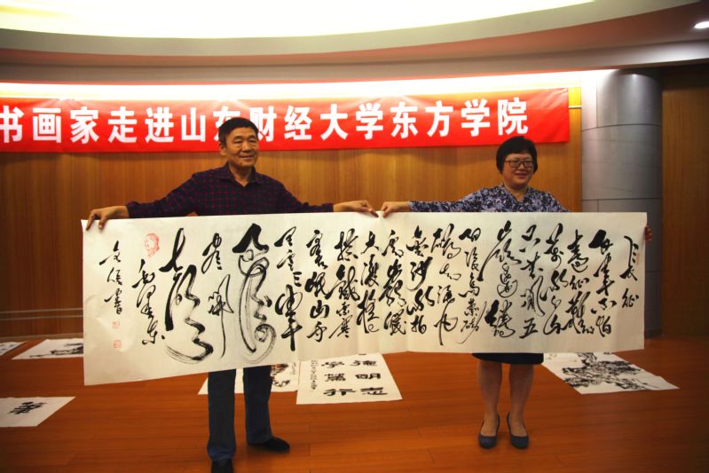 宋全信先生擅长毛体书法,他写的《长征》气势磅礴,气韵流畅,让人叹服。 “写字要走进字里面去,每一个字的结构都记在心里。”宋先生说。在书画创作间隙,书画家们还与东方学院的学子们交流了书画的技巧:起笔、插笔,什么是闲章,什么是名章等等。有的同学还有幸现场一试身手,得到了大家们的面授技艺,受益匪浅。