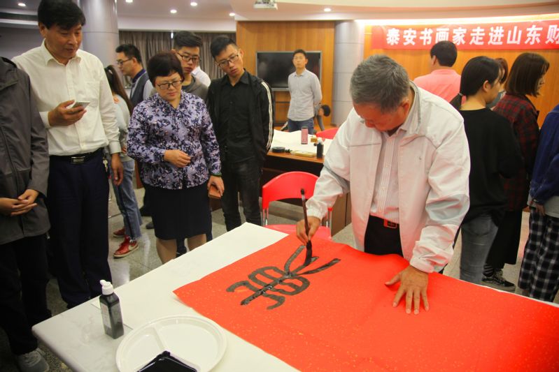 9月27日上午,在国庆的喜庆气氛里,泰安著名书画家一行9人来我校交流书画技艺,院长宫淑瑰参加活动并致辞,人文艺术系师生100余人参加活动与书画家们近距离切磋书画艺术。