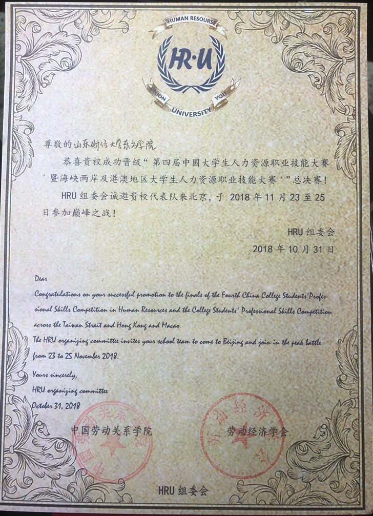 10月12日,由劳动经济学会和中国劳动关系学院联合主办的中国大学生人力资源职业技能大赛(HRU)暨海峡两岸及港澳地区大学生人力资源职业技能大赛北方赛区分区赛在山东工商学院举行,来自中国人民大学、南开大学、北京师范大学、中国劳动关系学院、北京理工大学、河北大学等高校的18支队伍参加了比赛。我校凌瑶、苏新民、韩天莲三位老师指导的团队获得了赛区二等奖,成功晋级全国总决赛,是唯一一所进入全国总决赛的独立学院。参赛团队的成员是:15级人力资源管理专业学生周璇;16级人力资源管理专业学生庄晓伦、尹皓玥、郭艳萍。周璇同学荣获个人奖项的最高奖——特等奖,尹皓玥同学荣获个人一等奖,庄晓伦和郭艳萍同学也获得了个人三等奖的好成绩。