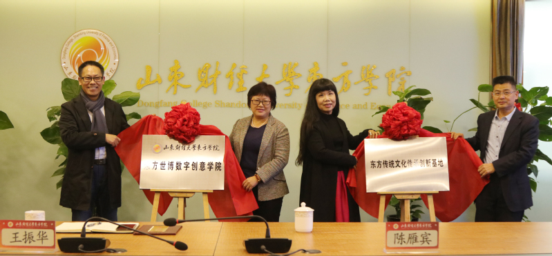 揭牌仪式上,耿金波首先宣读了《关于成立山东财经大学东方学院东方世博数字创意学院的决定》《关于成立山东财经大学东方学院东方世博数字创意学院理事会的通知》和《关于聘任王振华同志职务的决定》三个文件。王振华介绍了东方传统文化传承创新基地的主要任务和功能定位,对校企合作前景作了展望。
