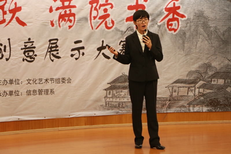 从讲述妖界世事百态、欢喜离愁的《百妖谱》到“飞雪连天射白鹿,笑书神侠倚碧鸳”的《金庸全集》。从解读先秦诸子的文化散文《寂寞圣哲》到意大利移民的后裔李•艾柯卡的自传《艾柯卡自传》。选手用清晰的思路、利用PPT、视频等方式多角度诠释了《寂寞圣哲》、《老人与海》等经典书籍。大赛中设置了有奖问答环节,同学们积极抢答,不仅得到了精美的小礼品,也体现了同学们自身的文化素养。大赛以古典舞《昨夜小楼又东风》收尾,以别样的形式展现了故国不堪回首之愁。