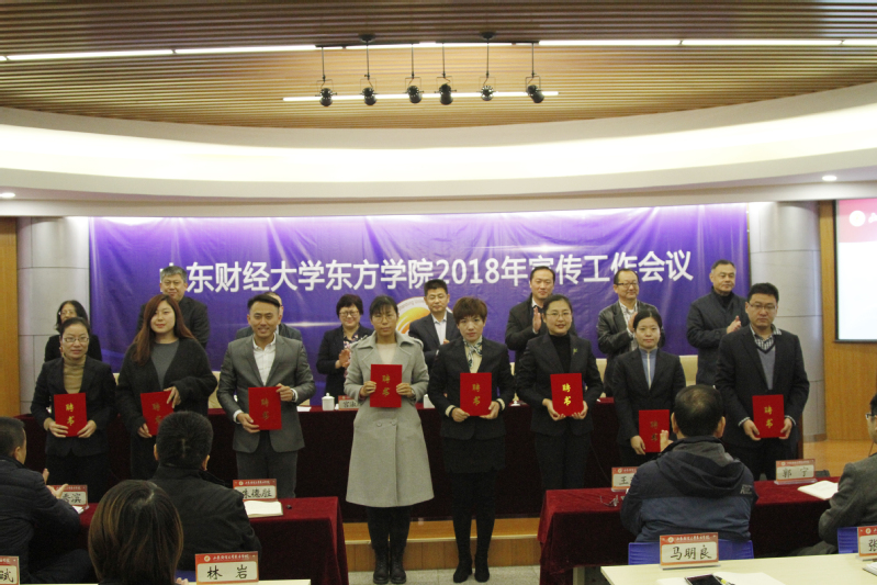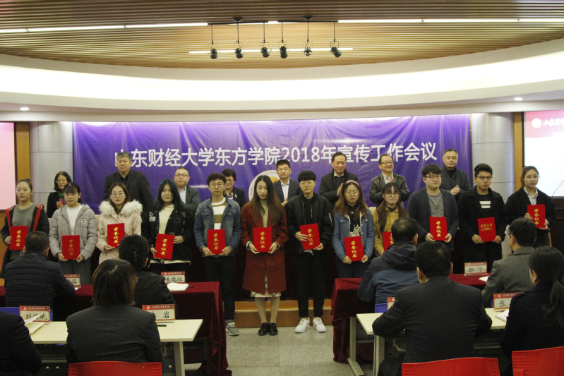 11月21日上午,山东财经大学东方学院2018年宣传工作会议在坤元楼多功能厅举行。会议的主题是: 总结2018年宣传工作,凝心聚力,推动学校宣传工作再上新台阶。会上,党委书记耿金波作2018年宣传工作总结报告,院长宫淑瑰发表讲话,对全校宣传工作做出部署。会上成立了山东财经大学东方学院新媒体联盟,发布了校歌MV,宣读了聘任教师通讯员的决定,并表彰了优秀新媒体平台和优秀学生记者,是一次总结经验、鼓舞斗志、开创学校宣传工作新局面的一次盛会。副院长王雪晨出席会议。校属各部门、各学院负责人参加会议。会议由宣传中心主任马慧茹主持。