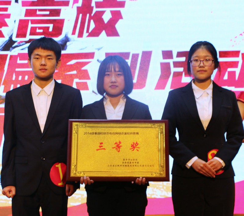 12月11日,作为“驻泰高校防范电信网络诈骗系列活动”收官之战,“2018年驻泰高校防范电信网络诈骗知识竞赛”决赛在紧张筹备近两个月后,在泰山学院拉开帷幕。通过前期选拔,我校和山东农业大学、泰山学院等8支驻泰高校代表队进入决赛。经过激烈角逐,我校最终获得三等奖。同时,由数据科学学院李茜茜等同学创作的微电影《“勿”入歧途》在“防范电信网络诈骗原创作品征集活动”中荣获三等奖。