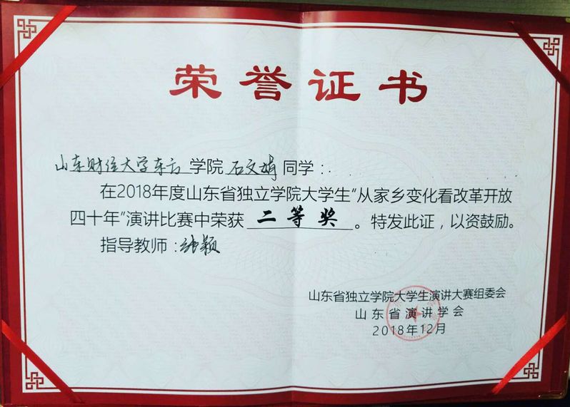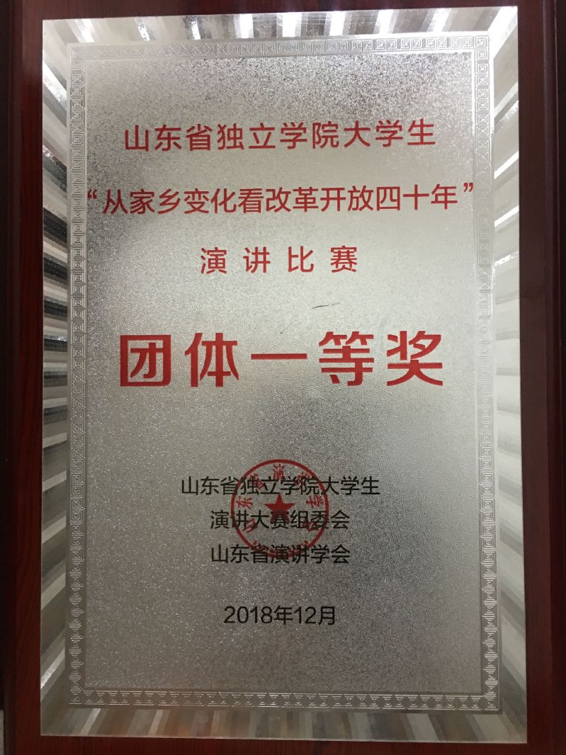 12月15日,我校张颖老师带队参加了由山东省演讲学会主办的“从家乡变化看改革开放40年”山东省独立学院大学生演讲大赛。此次大赛在山东财经大学燕山学院举行。