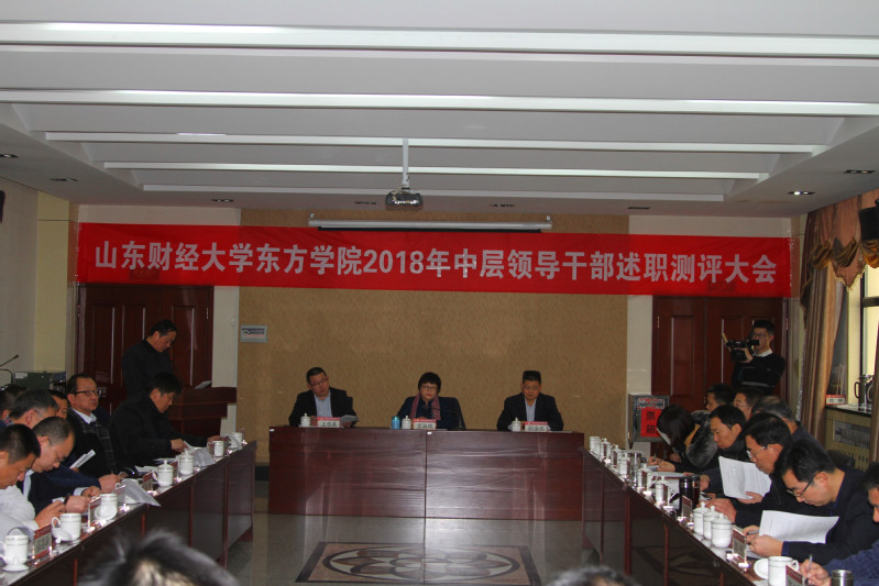 1月9日上午,山东财经大学东方学院2018年中层领导干部述职评议会在第一党员活动室召开。院长宫淑瑰主持会议,党委书记耿金波、副院长王雪晨出席会议。30名中层干部依次上台述职。