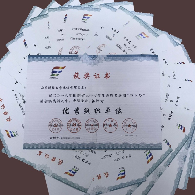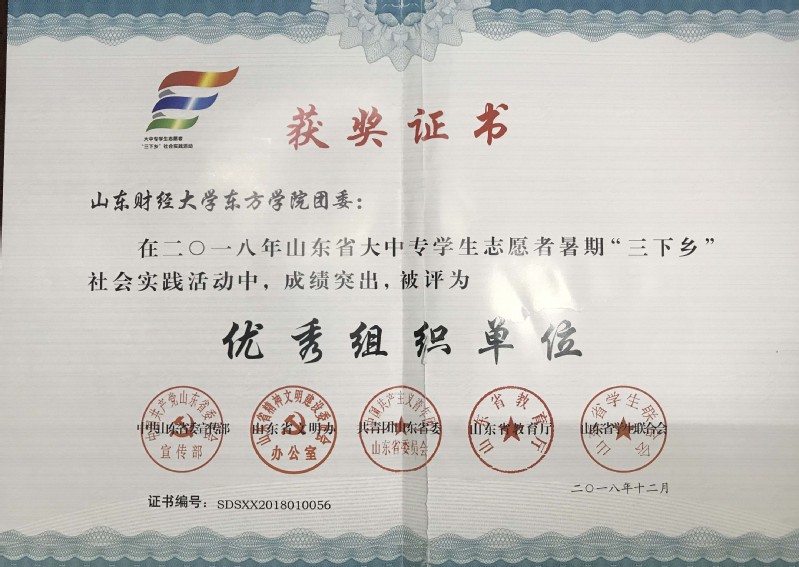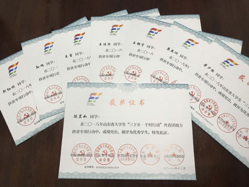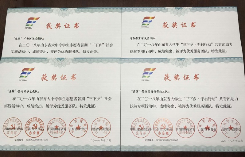 近日,中共山东省委宣传部、山东省文明办、共青团山东省委、山东省教育厅、山东省学生联合会联合下发《关于表彰2018年山东省大中专学生志愿者暑期文化科技卫生“三下乡”社会实践活动先进集体和先进个人的通报》,表彰在2018年山东省大中专学生志愿者暑期文化科技卫生“三下乡”社会实践活动中表现突出的单位、团队和个人。我校团委被评为“三下乡”社会实践活动优秀组织单位,这是我校团委连续五年获此荣誉;“追锋”广西河池支教队、“追锋”贵州习水支教队被评为暑期“三下乡”社会实践活动优秀服务队;宁阳教育帮扶团二队、“萌芽”帮扶团临沂帮扶二队被评为“三下乡•千村行动”共青团助力扶贫专项行动优秀服务团队;何堃等四名教师被评为优秀指导教师;卞龙涛等5名同学被评为“三下乡”社会实践优秀学生;王佳淦等8名同学被评为“三下乡•千村行动”共青团助力扶贫专项行动优秀学生。