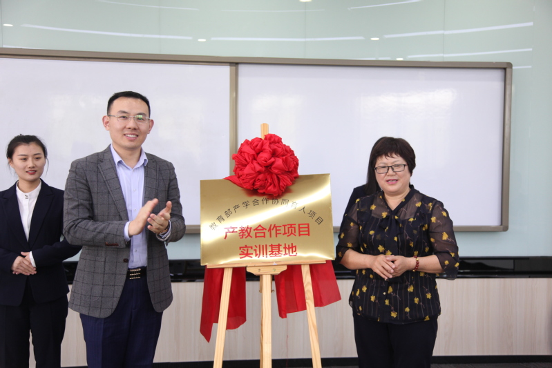 在热烈掌声中,宫淑瑰和苏乐一起为教育部产学合作协同育人项目实训基地揭牌。