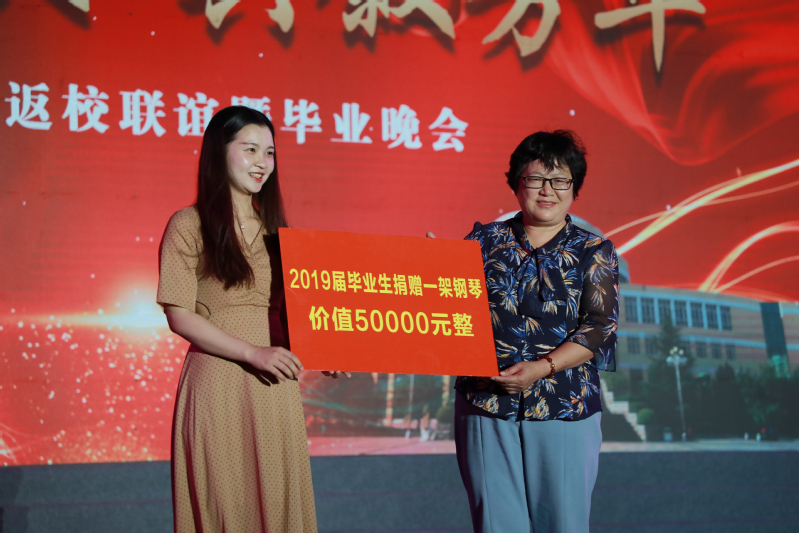 晚会上,院长宫淑瑰上台接受校友们赠送的钢琴一架,她说:“感谢校友捐赠的钢琴,祝愿校友们事业有成,毕业生们前程似锦、未来可期,常回家看看!”