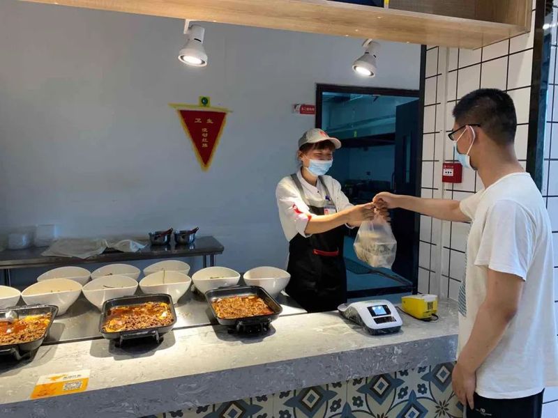 为让返校师生吃好、吃得安全,总务处饮食服务中心管理人员坚守岗位,履行防疫规定,保证餐饮供应。按防疫指南要求,餐厅广场设置了洗手池、足底消毒区、体温检测区。为方便就餐,多次在学校微信推文详细介绍餐厅就餐流程及美食分布,一至三楼提供10多个档口的20种饭菜。为减少就餐人员聚集,餐厅提供四种供餐方式,实现校内美团选餐配送,外卖可配送至宿舍楼下。