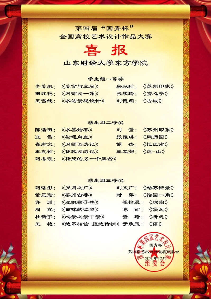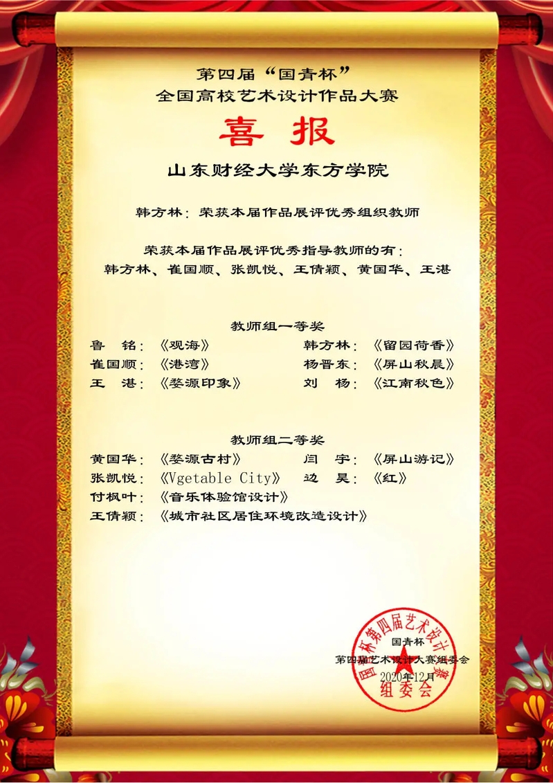 12月,由中国人生科学学会艺术与设计教育分会共同举办的第四届“国青杯”全国高校艺术与设计作品征集评选活动结果揭晓,山东财经大学东方学院参赛师生在本次大赛中斩获佳绩。