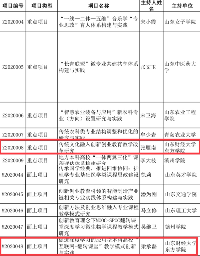 近日,山东省教育厅公布《2020年山东省本科教学改革研究项目立项名单》,我校申报的2项课题均获得立项,其中重点项目1项,面上项目1项。重点项目由省财政划拨经费5万元。