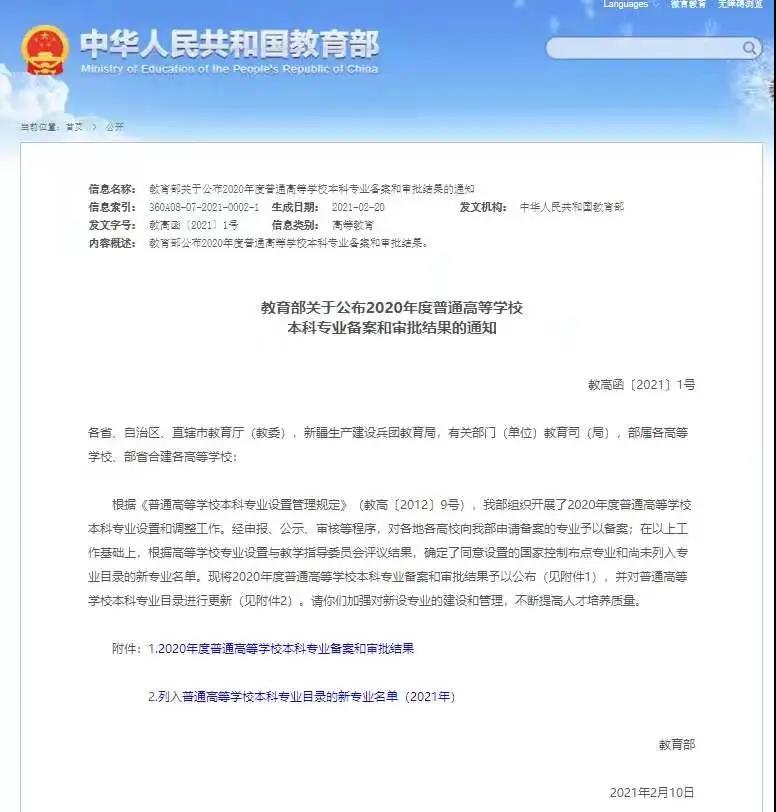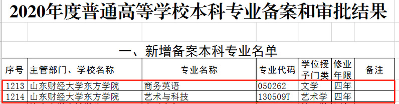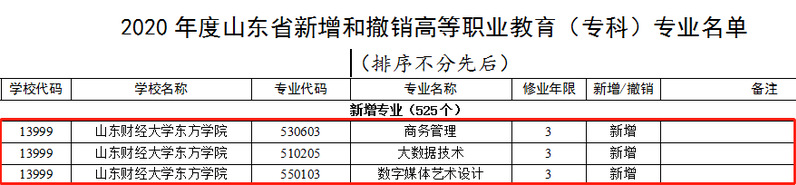 近日,教育部发布了《关于公布2020年度普通高等学校本科专业备案和审批结果的通知》和《2020年度山东省新增和撤销高等职业教育(专科)专业名单》,山东财经大学东方学院2020年申请增设的“艺术与科技”“商务英语”两个本科专业、“大数据技术”“商务管理”“数字媒体艺术设计”3个专科专业获批;同时撤销了“日语”“保险学”和“应用统计学”3个多年未招生专业。