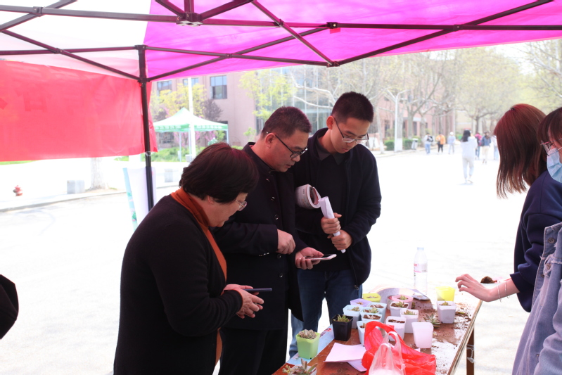 四月的春风拂面,活动现场也是一片热火朝天。记者团的小伙伴们热情讲解,老师同学们积极参与。扫描活动二维码,完善教育信息后进入活动主页面,大家即可领取魔豆或多肉一盆。“滴滴”的扫码声此起彼伏,每个人都get了属于自己的那抹绿色。每一位抱走绿植的师生脸上都洋溢着笑容,正如大家对绿水青山的满心期待。小小的多肉被捧在手心,它们作为春的使者被同学们带回宿舍,或放于书桌,或置于阳台,使东大每个角落都充满浓郁的春天气息。