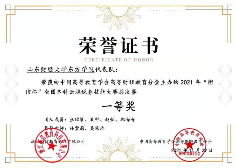 本届大赛历时2个多月,全国超过两百多所高校报名参赛,经过预选赛的激烈选拔共146所高校入围总决赛。我校财税金融学院吴修玲、孙雪莉老师指导,财税金融学院税收学专业张玹策、孔帅、赵怡、郭海奇组成的代表队,克服重重困难,沉着应战、奋力拼搏,经过激烈的比拼,获得了总决赛全国第4名的优异成绩,并获得大赛一等奖,团队奖金3000元以及院校奖励。主要包括税务会计课程数字资源实训系统(教、学、测)及配套教学资源1套、考试测评服务1次、2022年1+X个税计算职业技能等级(初级)证书社会考生考试名额30个。展现出了扎实的税收专业知识功底与笃思慎行、勇克难题的良好风貌。