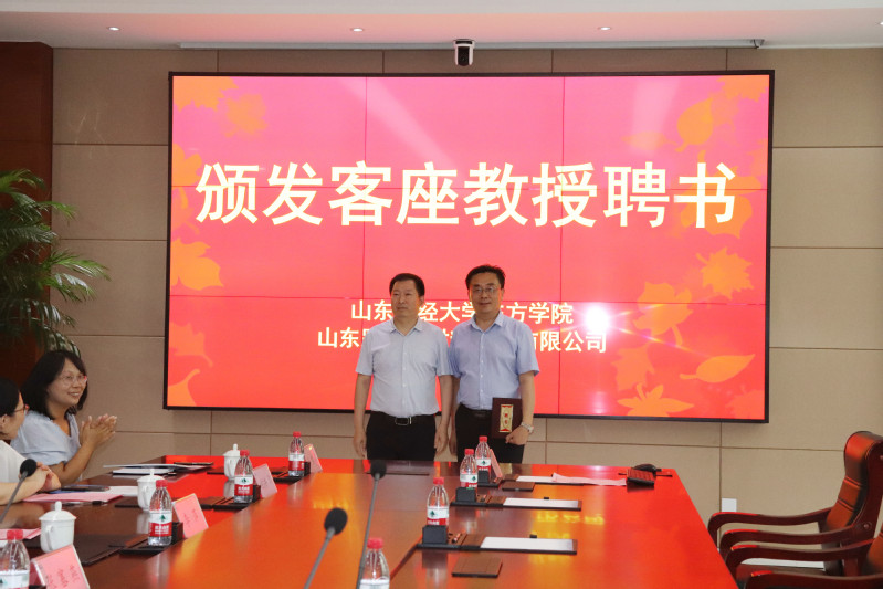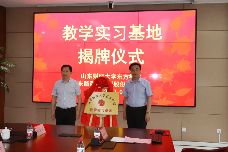 活动中,常务副院长宋保峰与山东路德总经理陆诗德共同为“教学实习基地”揭牌;宋保峰为陆诗德颁发了山东财经大学东方学院客座教授聘书。