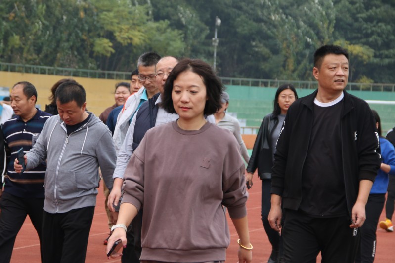 比赛还未开始,老师们已经陆续来到运动场集合,为活动积极热身。“喜庆二十大,开启新征程——金秋健步走活动”红色条幅醒目热烈。