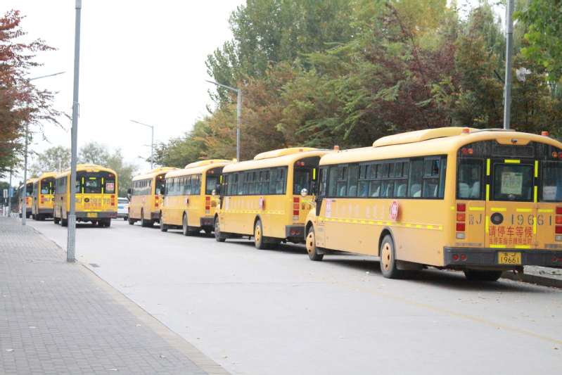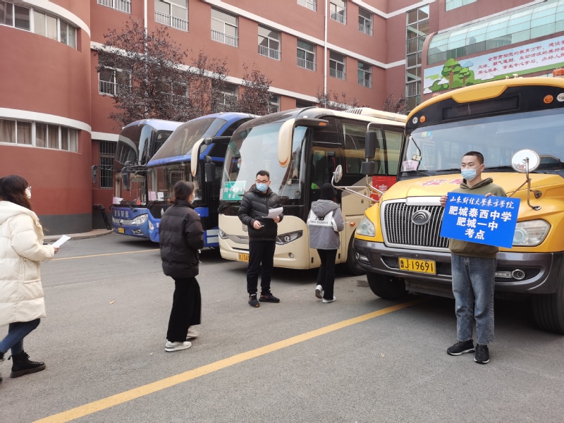 本次考试我校实际参加人数为1063人,考场分布在泰安市区、肥城、东平等13个考点。早晨,从最早一批5点30分发车,最晚一批11点30发车。为给同学们做好服务,确保防疫安全,每辆车上配有1名带队老师。